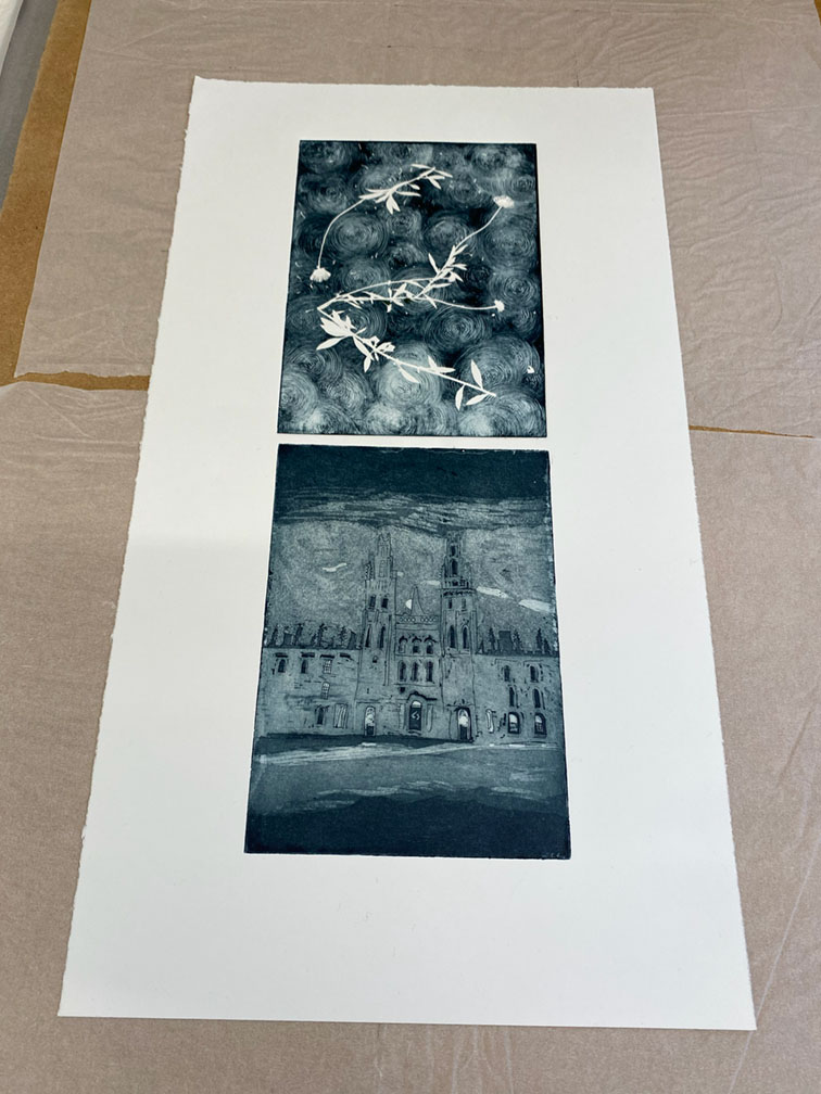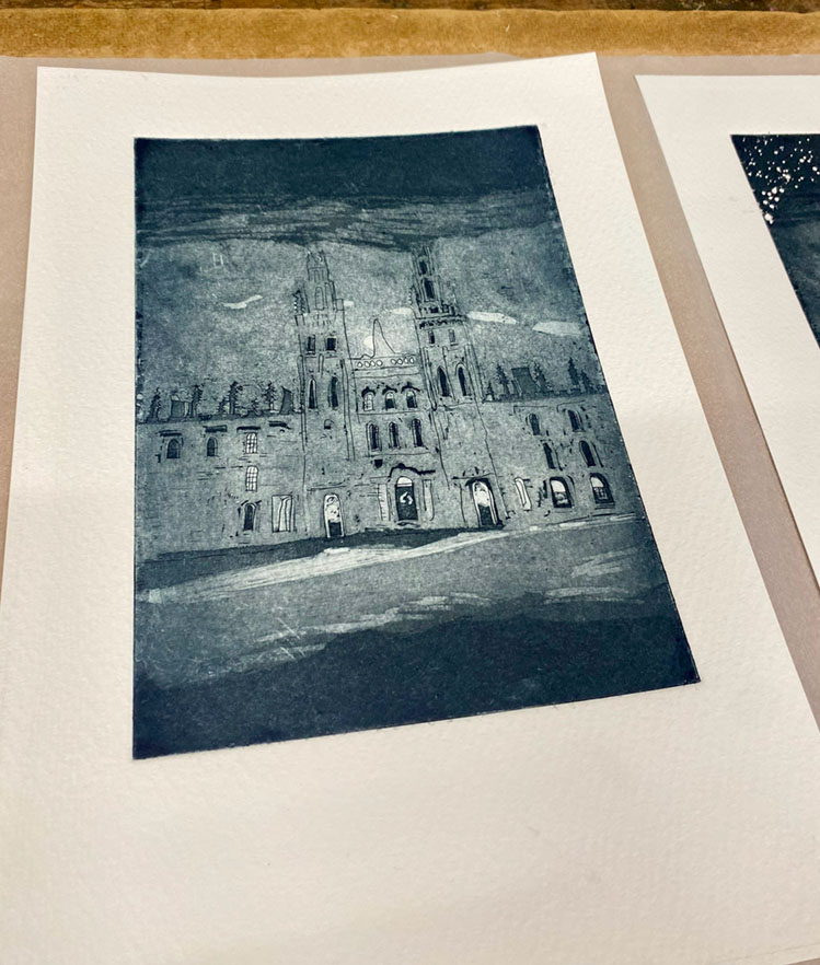 All of the prints produced as part of the ‘All Souls’ series were printed in Oxford Printmakers Studio as unique prints on a Harry F. Rochat press with Charbonel inks on 300g Langton paper. One framed piece was exhibited in the ‘North Wall’ Print Exhibition.