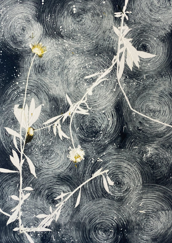 I started to incorporate dried and fresh wildflowers which I collected from the college quads into my prints of the towers, first overlayed on the buildings as I have done in many previous prints, but then in the stary skies high above the college. They appeared like souls or constellations within scrimmed swirls of inks printed from the unetched back of the tower etching. Fresh plants yielded green stained oils which smudged the pressed edge of the etched print like the fossilization process that I was working on as a visiting fellow of All Souls and again echoing the juxtaposition of order and wildness, rules and freedom, human imposed and nature.