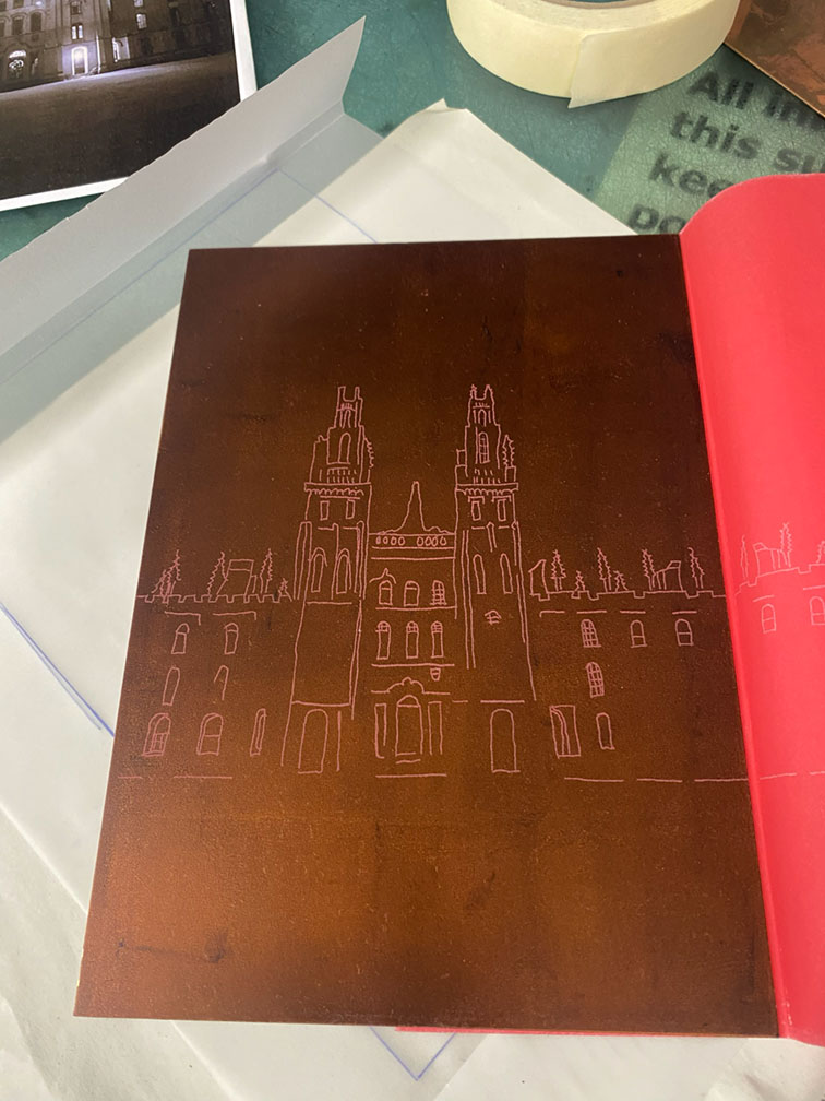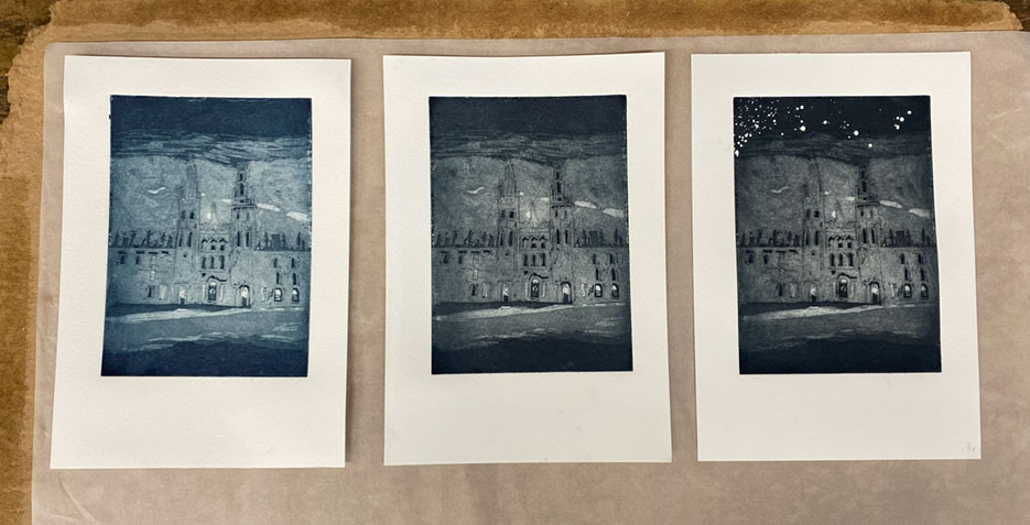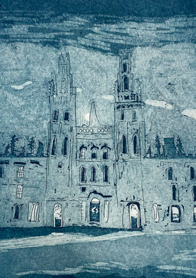 The name and original mission of the College inspired my print making in a subliminal way which only became apparent at the end of each printing session when I was ‘playing’ and experimenting with the back of my etched copper plate. The original plan for my etchings was to produce prints of the College’s imposing twin towers within it’s North Quad, designed by Nicholas Hawskmoor between 1716 and 1720. I had captured these stunning towers with a moonlight photo on the evening of one of the College’s feast nights. I used a traditional hard ground line etching followed by two iterations of aquatint to build shade and long shadows.
